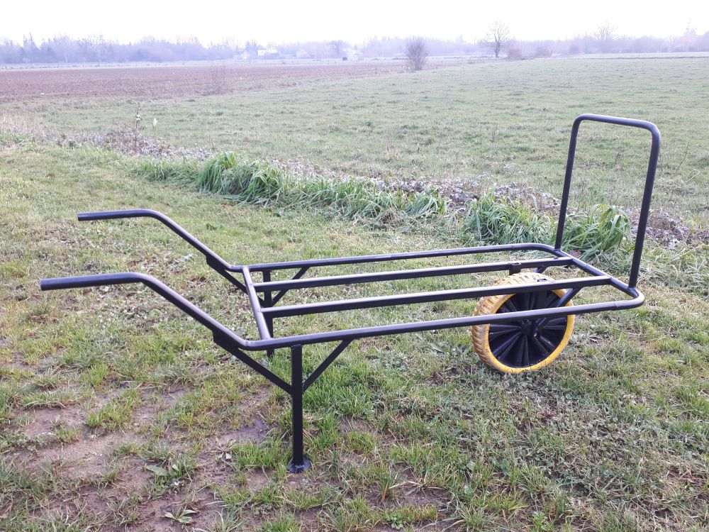 Brouette maraîchère légère en acier. Le plateau peut contenir 3 caisses standards de 40cm de large par 60cm de long.