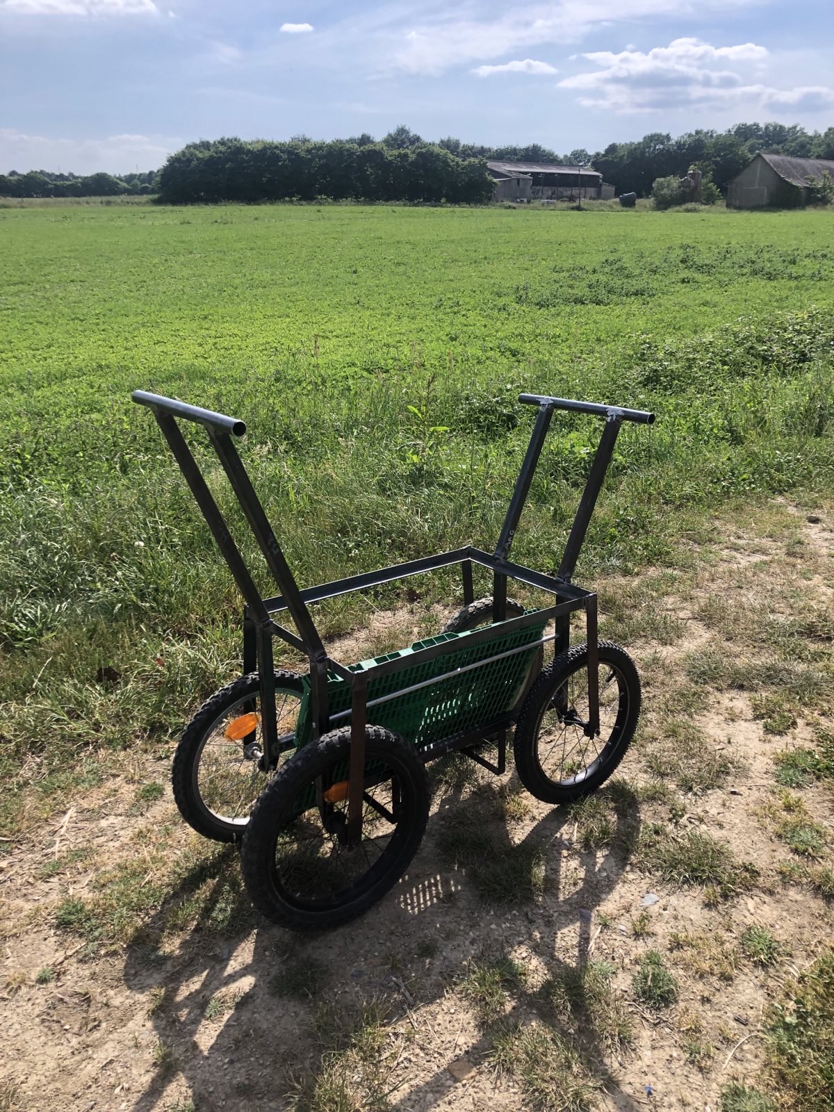 Chariot de maraîchage pour transporter des caisses et récolter confortablement.